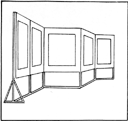 Для экспонирования плакатов в закрытых помещениях, наиболее простым оборудованием являются планшеты (рис. 2,3), которые изготовляют из досок, клееной фанеры, прессованного картона, закрепленных в рамку из деревянных реек. Панели из ДСП, досок и фанеры можно покрыть бесцветным лаком, окрасить в нейтральный, спокойный цвет (серый, охристый), либо обтянуть загрунтованным холстом. Рамы планшетов также покрывают лаком, либо окрашивают краской. Для удобства крепления плакатов рекомендуется использовать перфорированные панели со вставными штифтами.